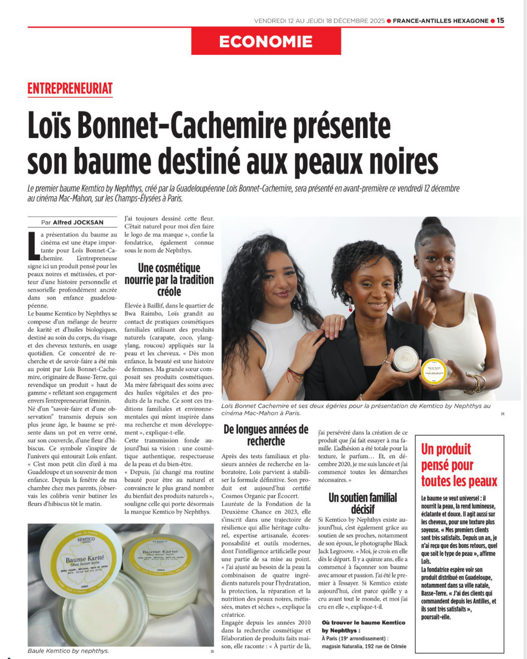 C’est avec une immense fierté que je vous partage aujourd’hui, à l’approche des fêtes de fin d’année, le tout premier article de presse consacré à Kemtico by Nephthys, publié dans France-Antilles. Cet article fort et inspirant vient couronner une année exceptionnelle. Il révèle en exclusivité la toute première image officielle de deux modèles de la marque Kemtico by Nephthys